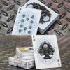 Mixing skull, gears and many other artifacts, the designs of every card in this deck will captivate. A magnificent work in a dark and highly detailed deck that reveals some kind of disturbing atmosphere thanks to the mix of gold and silver tones and a black background.