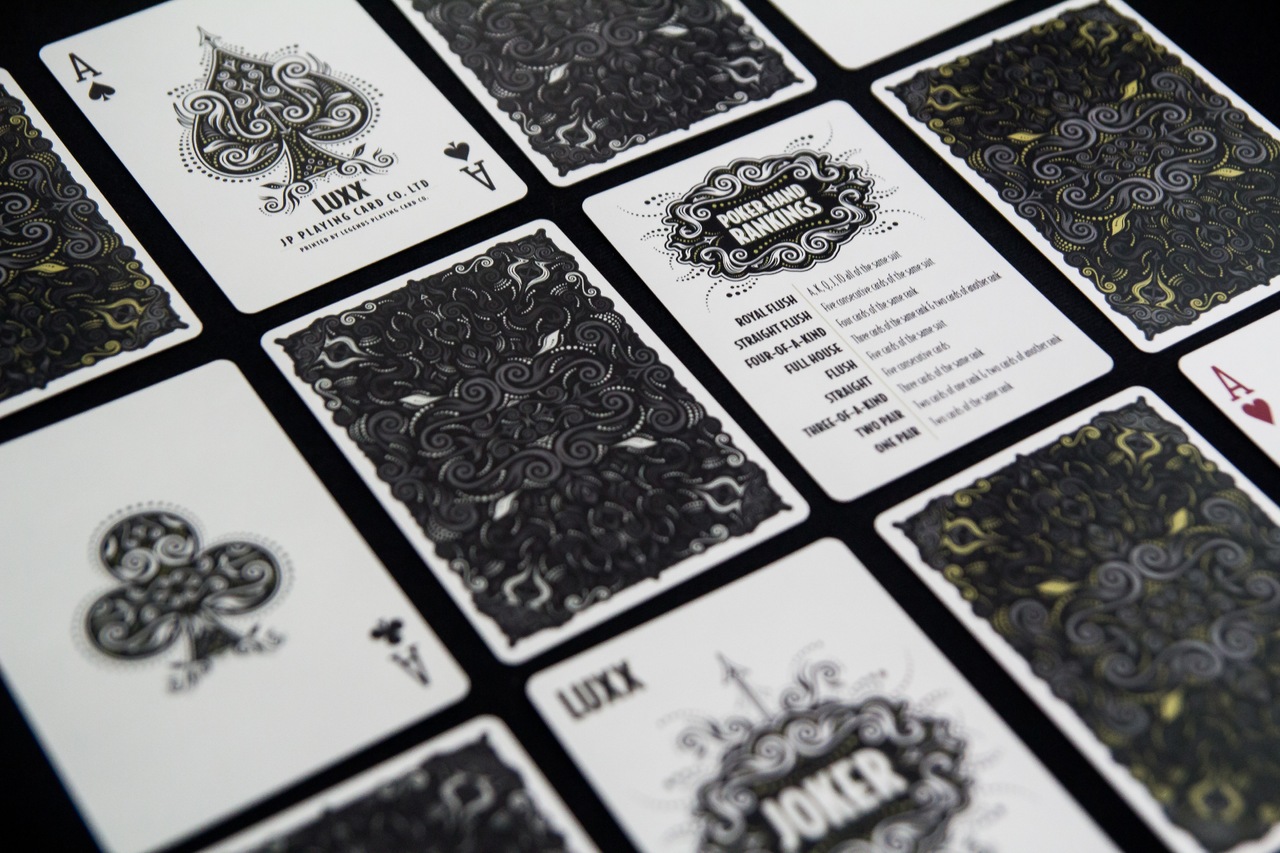 The card backs have the same design with intricate designs like the original, but now have grey and black tones with silver metallic inks, and the shading is designed to emphasize the visual beauty of spreading and fanning. The only change to the court cards and pip cards from the first edition is that metallic gold and red ink is used for the suits, instead of using different colours for each suit as in the first edition. The court cards are inspired by a classical design, but have all kinds of elaborate touches to add an element of sophistication and style, such as detailed borders, and a design of dots within the pips themselves. The Ace of Spades is every deck's signature card, and with the LUXX Shadow it makes a clear statement of style, with the help of ornate patterns and elaborate line-work.