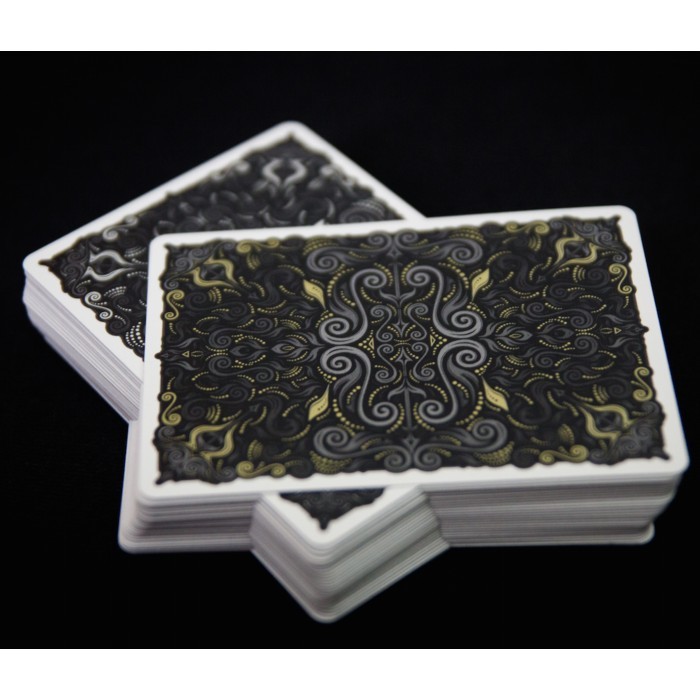• The card backs feature the same intricate design from Randy we all loved, but based in tones of grey and black with silver and gold metallic inks. The shading creates a very cool effect when spread and fanned.