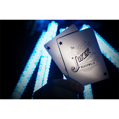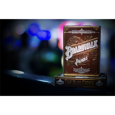 The Boardwalk Papers deck was inspired by boardwalks and small theme parks of yesteryear, with a really fun vintage vibe. The back design, tuck, Ace of Spades, and Jokers feature fully custom & hand-drawn artwork by Drew Melton with enhancements by Randy Butterfield. The back looks AWESOME in a vintage-style two-tone brown design. The tuck box has gorgeous Gold and White Foil, plus embossing and inside printing, and we've topped it off with a custom seal. All of the faces (Courts and spots) are standard design with a custom color scheme.