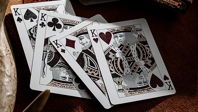 This Standard Edition features two monochromatic back-designs: Hunter Green and Deep Maroon. Twin Bucks are enshrined within beautiful flourishes that mimic the lush greenery found within Yosemite National Park. The Ace of Spades features a noble Buck with herbaceous ornamentation crowning his dignified antlers, and each Joker offers the Antler name. The tuck-case features rich embossing and metallic accents all around.