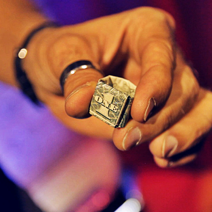 Borrowing a dollar bill of any denomination from a spectator, you ask them to fold it and place it on your hand. A fraction of a second later, and before their own eyes, the bill is now folded into a ring around your finger! Your audience won’t believe their own senses! Have them remove the ring and they now have a souvenir to show off for the rest of their lives.