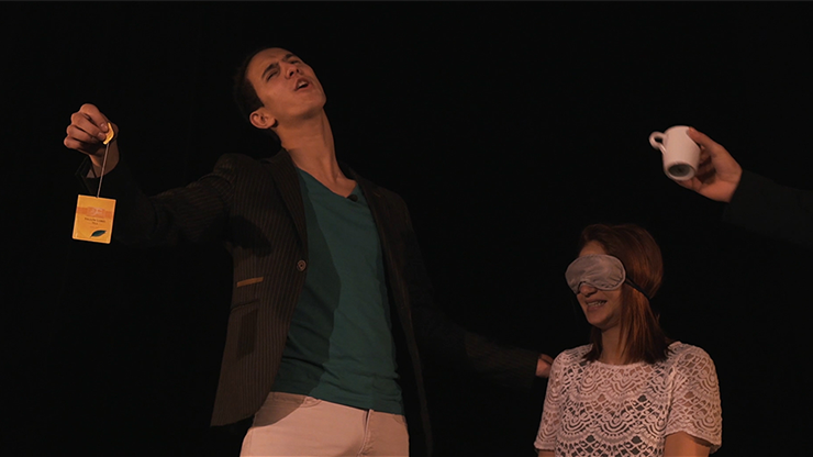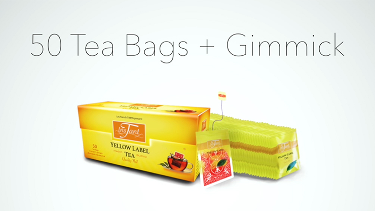 A card is visually changed into a tea bag. Make anything appear within this totally closed and observable bag, thought card, or any object fastened to the end of the thread (it could be a map, a ring, a capsule, a signed card, a ticket, a prediction...)