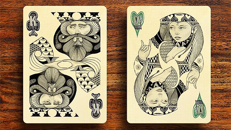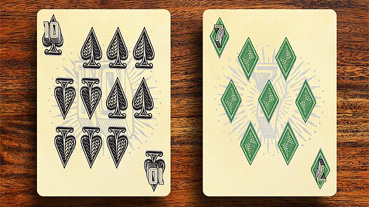 Illustrated by hand in charcoal and ink, this unique deck features original suits, court cards, jokers and 2 bonus gaff cards. Printed in green, black and metallic silver inks on a parchment field, using high quality Bicycle-grade paper with an embossed finish. Designed in San Francisco, California and manufactured in the U.S.A. by the United States Playing Card Company.