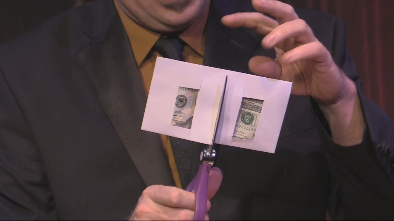 And you'll learn how to cut a borrowed dollar in half, then restore it, while it's secured in an envelope, yet visible through two large windows.