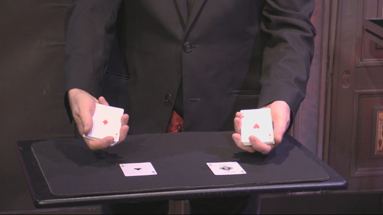 And the aces make a surprise appearance when a spectator tries to guess their card. Turns out it's an ace, so naturally the other cards change to match it.