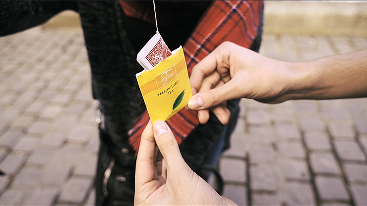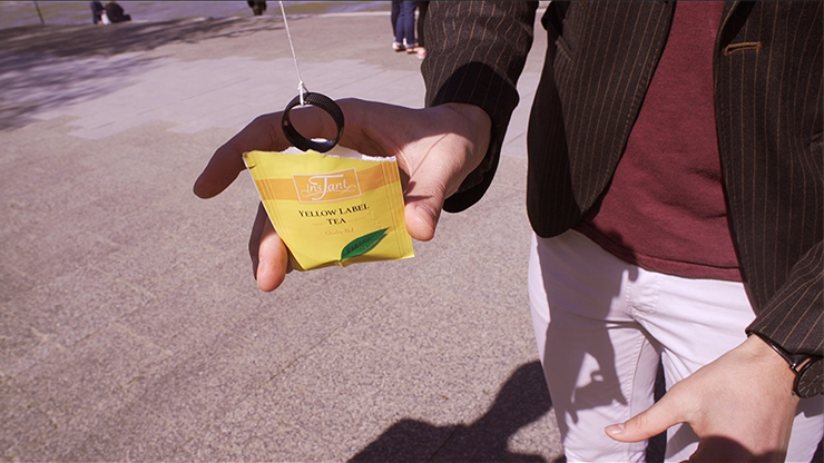 A card is visually changed into a tea bag. Make anything appear within this totally closed and observable bag, thought card, or any object fastened to the end of the thread (it could be a map, a ring, a capsule, a signed card, a ticket, a prediction...)