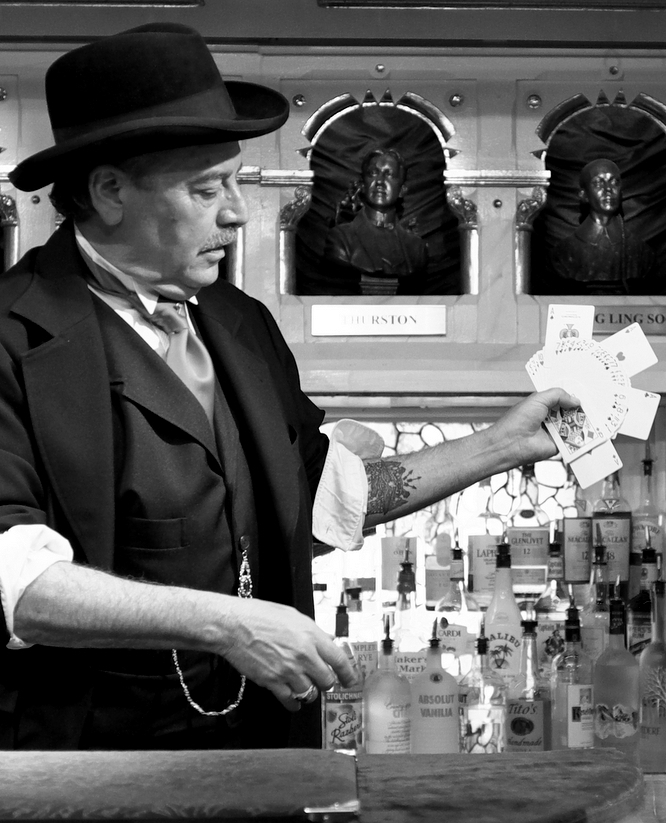The spectators can be very close--Pop performs at the table in the Close-Up Gallery and at the bar in the WC Fields Bar of the Magic Castle.