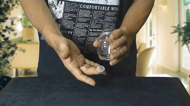 The magician holds the coin on his/her finger and slowly brings it towards the bottom of the container.