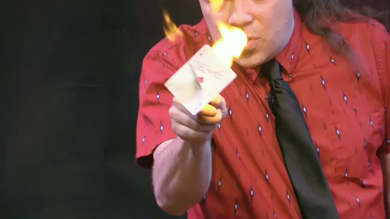 3. Flash Card Stab: Combining danger with drama, a freely chosen and signed playing card is revealed impaled on the blade of a knife in a blazing flash of fire.