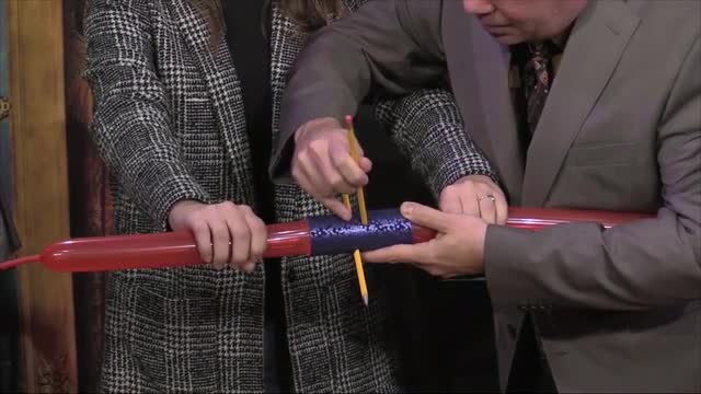 Two pencils penetrate a standard 260 balloon trapped in a tube without any damage.