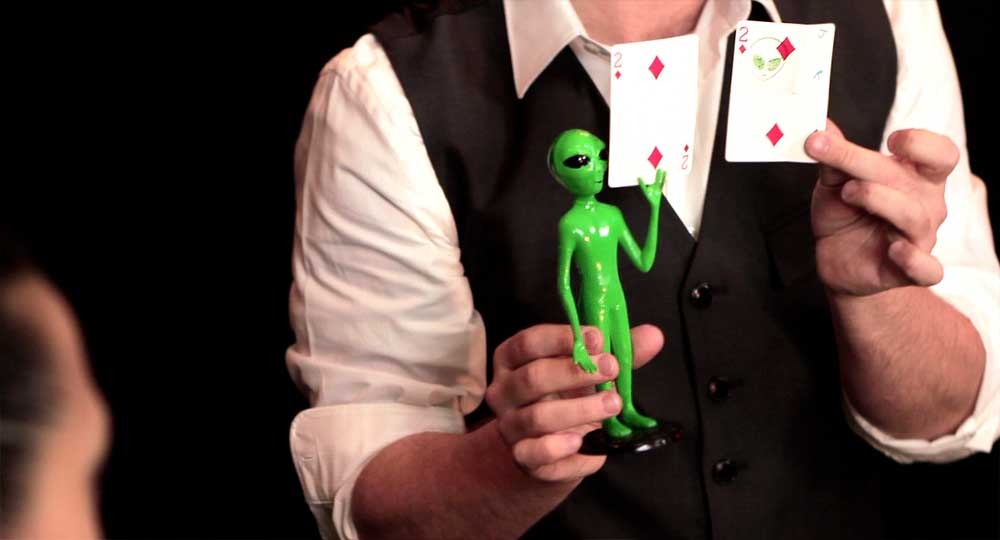 An eerie journey in thought manifestation that uses a toy plastic alien and a burst of light to make an alien face appear on a signed playing card being held tightly between the spectator’s hands.