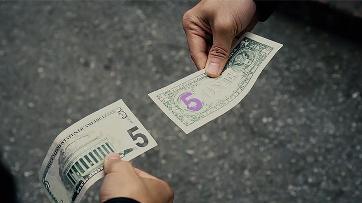 Two bills ($1 and $5) are removed from your wallet and presented to the audience. You ask a spectator to hold the $1 bill and you hold onto the $5 bill. Then, with just a little touch of these two bills together and a magic snap, a number 5 is now printed on the $1 bill! And that's not all - the 5 is GONE from the $5 bill - it is now just a hole! The spectator can then examine the money that they are holding in their own hands as much as they want, and they absolutely pause in stunned silence by what has just happened.