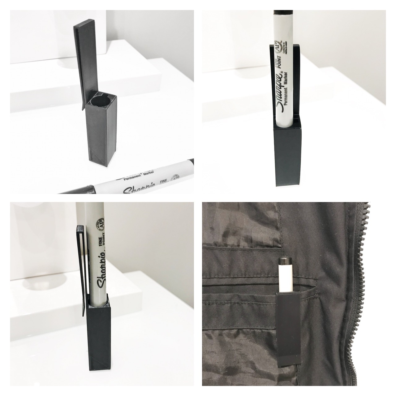 The Ultimate Sharpie Holder is designed to holdout gimmicked Sharpies that have a Stamper or writer on the end. The holder hooks onto your inside jacket pocket or back trouser/jeans pocket and keeps the gimmicked part of your Sharpie above the pocket line making accessing your gimmick a breeze.