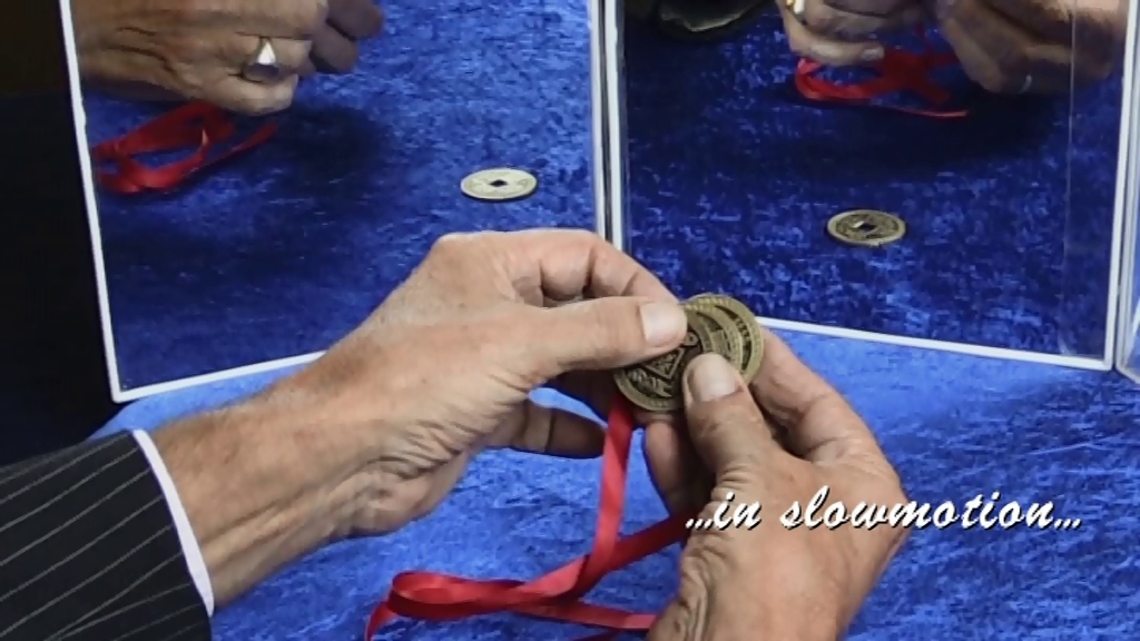 coins traveling or disappearing or going through a table: just 4 Chinese coins penetrating a ribbon.