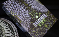The Tuck Box is highlighted by the symmetrical Dragon Scales design. The Tuck is produced on a Black Matte paper stock, features a Green FOIL, and a Pantone Grey that also has a Clear UV Spot Ink overlay. The Draconian Wildfire Deck is perfect for any Collector, Card Player, Magician, Flourisher or fan of Dragons!
