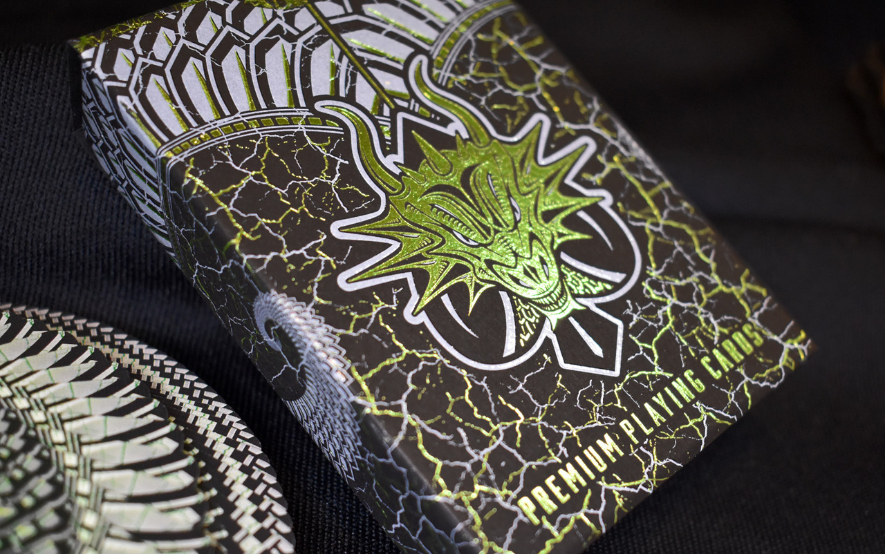 The Back Card features a borderless optical illusion design formed from Dragon Scales. The semi-custom Face Cards incorporate a clean design that keeps them functional and provides the highest level of playability. Each Card Back and Face contains elements of borderless green wildfire fissures throughout a rich black background. The details are crisp and the colors are striking.
