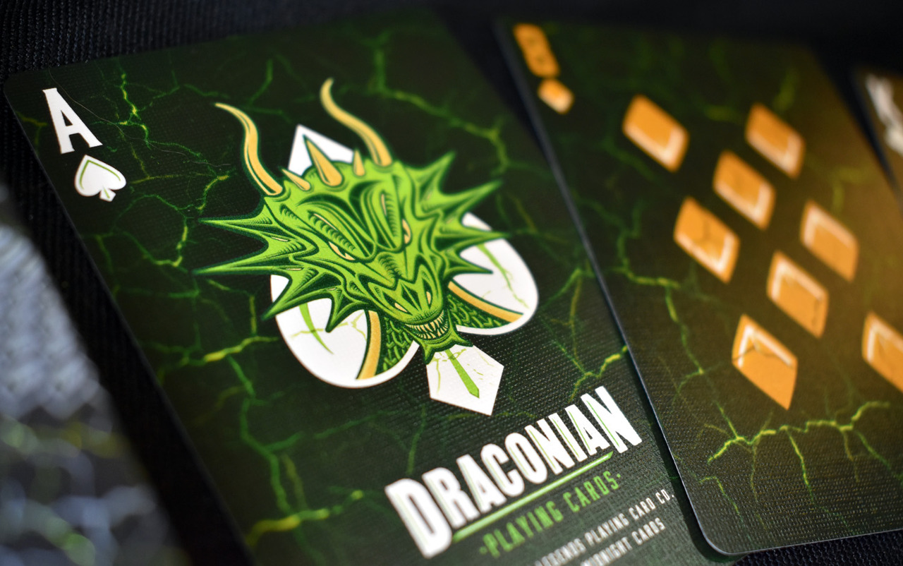 Inspired by Dragons of lore, the Draconian Wildfire Deck exudes the energy of an intense green fire. Printed by Legends Playing Card Co., with their Taiwan printer, the Draconian Wildfire Deck utilizes their exceptional Classic Finish.