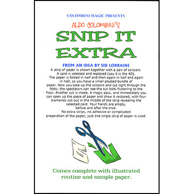 From an idea by Sid Lorraine. A strip of paper is shown together with a pair of scissors. A card is selected and replaced (say it is the 4D). The paper is folded in half and then again in half and again in half, so you have a small pleated bundle of paper. Now you take up the scissors and cut right through the folds; the spectators can see the cut folds fluttering to the floor. Another cut is made. A magic pass, and immediately you can open up the piece of paper and show it restored, with four diamonds cut-out in the middle of the strip revealing the selected card. Your hands are empty, before and after the trick. No extra strips, no adhesive or complicated preparation of the paper; just one single strip of paper is used. Comes complete with illustrated routine and sample paper.