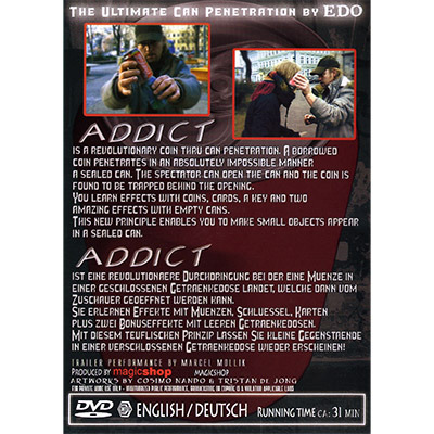 Addict is a revolutionary coin thru can penetration. A borrowed coin penetrates in an absolutely impossible manner a sealed can. The spectator can open the can and the coin is found to be trapped behind the opening. You learn effects with coins, a key and two amazing effects with empty cans. This new principle enables you to make small objects appear in a sealed can.