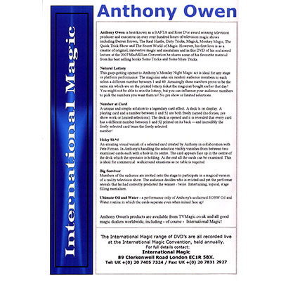 Anthony Owen is well-known as a BAFTA and Rose D'or award winning television magic producer and executive on over one hundred hours of television magic shows including Derren Brown, The Real Hustle, Dirty Tricks, Magick, Monkey Magic, The Quick Trick Show and The Secret World of Magic. However, his first love is as a creator of original, innovative magic and mentalism and in this DVD of his acclaimed lecture at the 2007 MacMillan International Magic Convention he shares some of his favourite material from his best selling books Some Tricks and Some More Tricks.