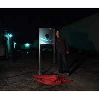 Members of the audience are asked onstage to inspect a 24" metal plate with a 7" hole cut in the center. After they've inspected it to their satisfaction they're invited to sit down. The illusionist then sticks one arm through the center of the hole and grasps the edge of a curtain with the metal plate trapping his arm and separating him from the front of the stage. In one violent motion the magician is now standing in front of the metal plate apparently having either passed through it or teleported from one side to the other.