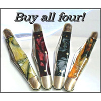 This Sunset Yellow with Burnt Amber color changing knife is built to last! It is a custom made, high quality knife with 3 high polished stainless steel blades, solid brass liners and pins and nickel silver bolsters. This knife has deep etched thumb pulls located on both sides of every blade for an extra added subtlety. The slightly rounded shape makes the "paddle move" easy to perform and very deceptive. The size is 3 ½ inches long, ½ inch wide and ¾ inches tall. This is not a cheap dollar store knife. The machine work is precise in every detail. The handles are absolutely beautiful. A matching Sunset Yellow ungimmicked knife is also available in a limited supply. Just see what some working pros say about our Color Changing Knives!