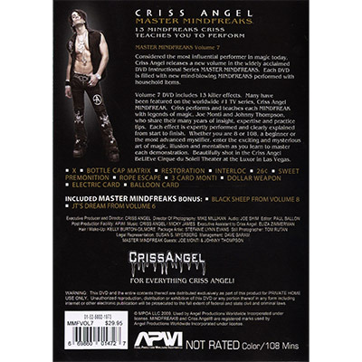 Volume 7 DVD includes 13 killer effects. Many have been featured on the worldwide #1 TV series, Criss Angel MINDFREAK. Criss performs and teaches each MINDFREAK with legends of magic, Joe Monti and Johnny Thompson, who share their many years of insight, expertise and practice tips. Each effect is expertly performed and clearly explained from start to finish. Whether you are 8 or 108, a beginner or the most advanced mystifier, enter the exciting and mysterious art of magic, illusion and mentalism as you learn to master each demonstration. Beautifully shot in the Criss Angel BeLIEve Cirque du Soleil Theater at the Luxor in Las Vegas.