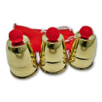 The brass set of cups has a magnet set into the bottom of one cup. The balls are crocheted for noiseless use. One of the balls has magnetic material inside. All the cups and balls routines are possible with this set.