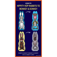 Two rabbits, white and brown. White rabbit turns into a brown and vice versa. Again they change into their original colors. As a sucker climax white rabbit turns into a monkey and brown rabbit into a donkey. This is an improvised version of regular Hippity Hop Rabbits with magnet to shift the metal fake. Handy to handle. No need to put your fingers inside the box to lift the fake.