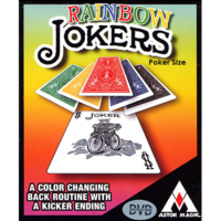 Four face up blue backed jokers turn over in a surprising manner, turn face up again, but now each joker has a different colored back. As a finale all the jokers have blue back again.