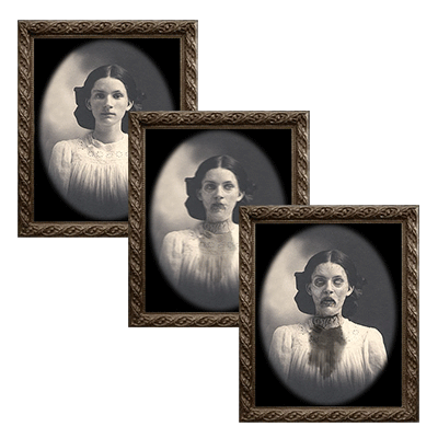 These high-quality pieces are a truly unique form of art, yet still affordable for the average "home haunter." Use them to spice up a Halloween Party, a Haunted House maze, or your own year-round ghostly gallery! No batteries, electricity, or special lighting required! Just put the portrait in a frame and the ghostly entities will do all the work!