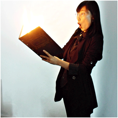 The magician presents a hard cover book, opens the cover and flames erupt from the pages! The book is closed extinguishing the flames and when opened again, an item that could not possibly fit in the book, instantly appears!