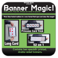 Banner Magic! is the latest magic product created by Michael Mode. Designed for professional magicians, Banner Magic! is three time-tested routines, Princess Card Trick, 52 on 1 and The Long Card, in a new banner format that opens and closes like magic. The perfect prop to have on hand when you need extra performance material. Pack small. Play Big. Always be ready to (un)roll.