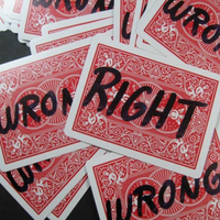 Suddenly one card has the word "right" written across its back. this card is dealt onto the table face up. It is the Three of Hearts! The remainder of the cards are shown, all having the word "wrong" written across their backs.