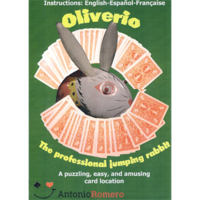 After spreading the deck on the table and showing all its cards, you introduce Oliverio, The Professional Jumping Rabbit who, thanks to his powers, is able to locate any card. To prove it, you have a card selected and returned to the deck. To make it more challenging for Oliverio, you cut and shuffle the cards. Then you spread the cards in a circle. A spectator winds up Oliverio and sets him in the center of the circle. The rabbit begins to jump around amongst the cards, eventually stopping at one of them. You set that card aside and swipe the rest of the cards away. The spectator names his card, which proves to be the one Oliverio stopped at. Oliverio did it again.