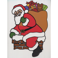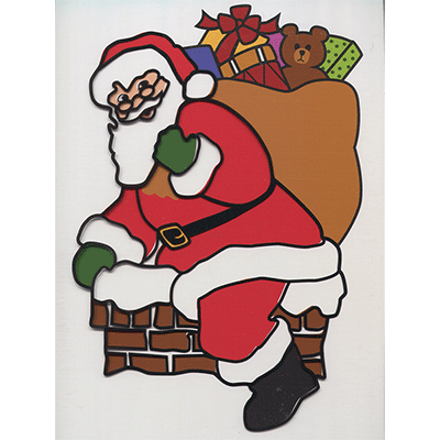 Effect: An colorful black and white Santa Claus is perched on the top of snow covered chimney. He is carrying nothing on his back. Suddenly, not only does he take on color, but a sack full of toys appears on his back.