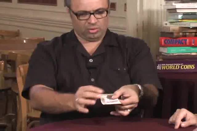 A coin passes through a note/bill borrowed from a member of the audience.
