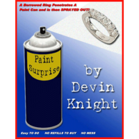 Effect: Devin Knight has taken the borrowed ring effect to a NEW level. Performer asks to borrow a ring from a lady. You state you will MARK her ring so it can be identified later on. You bring out a can of black spray paint and begin to shake it, stating you will mark her ring with some black paint. The audience howls with laughter at this point. As you shake the can, they hear the metal ball inside the paint can mixing the paint, it's a loud clanging noise. Suddenly, the noise changes to a softer tingle!