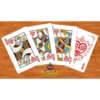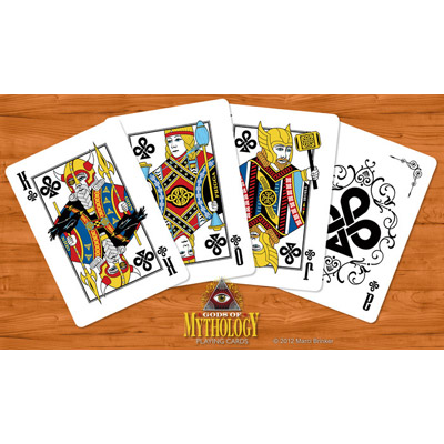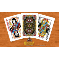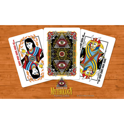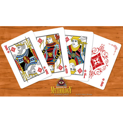 As said before, each suit represents one mythology. This way, hearts, diamonds, clubs and spades are related to Greek, Roman, Norse and Egyptian mythologies. There are 52 cards, completely customized plus two jokers, one double backed card and a gaff card for magic tricks.