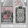 Civil Unrest is a limited edition run consisting of two tuck cases. One tuck case represents the Union while the other represents the Confederacy. In addition to two seperate tuck cases, this deck features two title cards, two ad cards naming who's who within the court and a special gaffe card which consists of one of the ad cards having a back with a color scheme of to match the Confederate tuck case. In addition, the jokers are designed to be placed side by side to form a larger image of two Civil War boats firing upon each other.