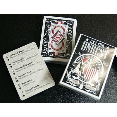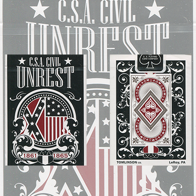 Civil Unrest is a limited edition run consisting of two tuck cases. One tuck case represents the Union while the other represents the Confederacy. In addition to two seperate tuck cases, this deck features two title cards, two ad cards naming who's who within the court and a special gaffe card which consists of one of the ad cards having a back with a color scheme of to match the Confederate tuck case. In addition, the jokers are designed to be placed side by side to form a larger image of two Civil War boats firing upon each other.