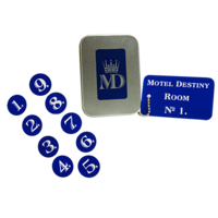 The performer takes out 9 chips and a key holder from a box. The chips are numbered from 1 to 9 representing the different room numbers.