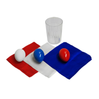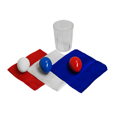 The white egg is placed into a tumbler and covered with an ordinary pocket handkerchief.