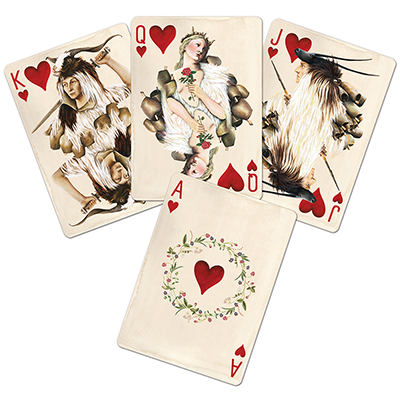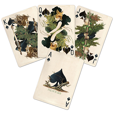 Taking that primal experience and expressing it visually led us to the Pagan era. This was a time in history when religious belief went hand in hand with people's everyday interaction with nature. The expression of this belief played out in different festivals, customs and myths in countries around the world. We chose the pagan regions and customs that covered the fjords and forests of Scandinavia, to the mountainous lands of Central Europe and the misty shores of the British isles to finally, the vast, endless forests and tundras of Russia for inspiration. Those lands bear a resemblance to the forests of the US whose trees, plants and woodland animals and their intense, earthy colors made their way into the costumes, pips and patterns we created for the original artwork in the "Pagan" deck.