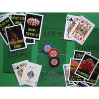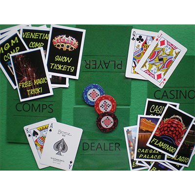 Full, easy to follow instructions; custom poker chips; casino cards, with gimmicked card; comp cards; blackjack lay-out placemats.