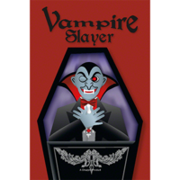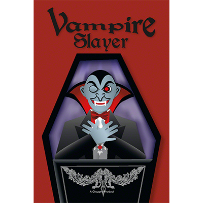 Your spectator signs the card, then takes it, face-down, and pushes an Official Vampire Killing Wooden Stake (tooth pick), through the vampires heart. When the card is turned over, the Vampire has changed into a skeleton. Dracula is Dead! Long live the Slayer!