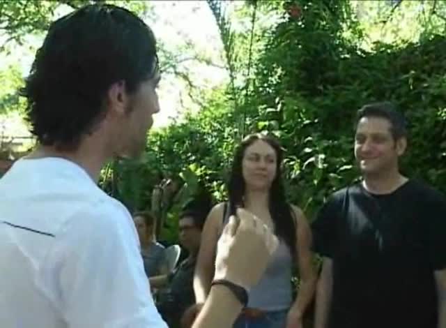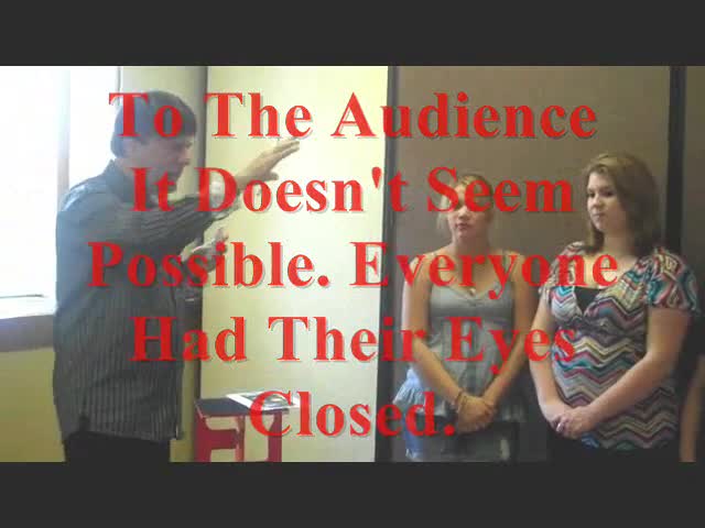 The performer begins to get impressions. He says, "Straight lines are more difficult to transmit then curved lines. If the symbol you are thinking of has straight lines in it, then please close your eyes and draw the icon in your mind. See the straight lines in your mind, so I can get impressions of what you are thinking."