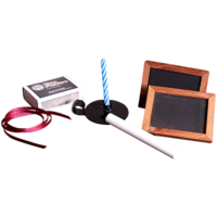 The spectator mentions his card close to the candle flame, like a ritual, and then the magician unknots the ribbon and shows that now the name of the card is written in chalk on one of the slates.