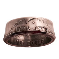 This uncirculated 1976 Bicentennial Kennedy Half-Dollar has been transformed into a ring. Each ring is unique and took hours to make. In the old days coins were beaten with a spoon or hammer to create a silver dent-faced ring. However this ring was created by a modern day wizard who's used a method for keeping the artwork on the coin mostly intact inside and out. Plus, the ring has been polished and custom sized to fit you! This numismatic jewelry can be displayed and worn as a piece of art or used to do a Karate Coin, Spellbound, Ring & String, etc.